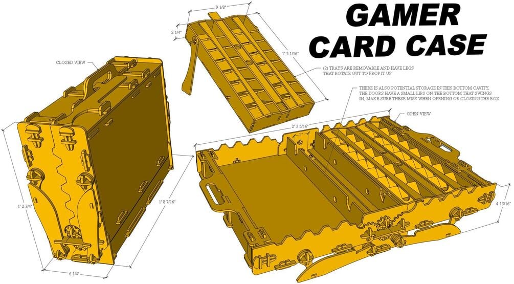 This is the Gamer Case made entirely from 5.2mm MDF using no metal fasteners or glue (the inside trays are glued together though). It has legs that drop as the doors open to support the case while you display your cards or whatever you want. The interior trays are removable and have legs to keep them propped up during game play. This can be painted or customized to your liking.